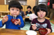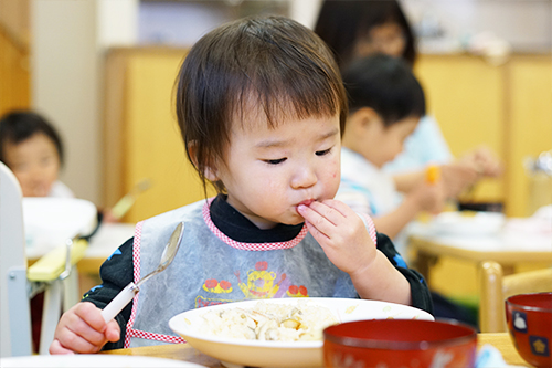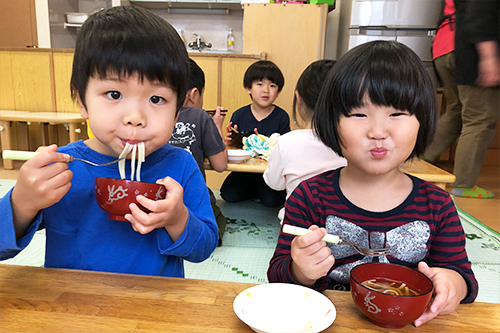 日中、体を動かしてたくさん遊んだ後のお昼ごはんは格別!保育所内の台所で、その日に調理したものをみんなで一緒に食べます。